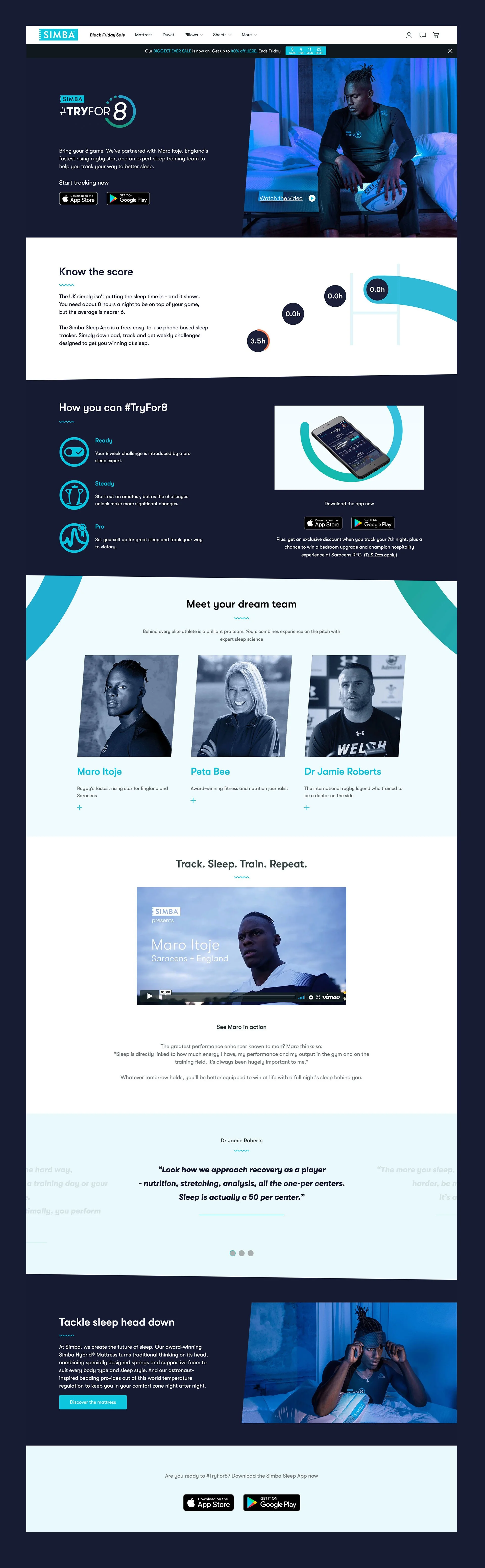 In the build up the the 2019 Rugby World Cup Simba Sleep launched a brand collaboration campaign with England Rugby star Maro Itoje. Simba’s Try for 8 campaign was all about training yourself to take on their eight week sleep challenge to be as ready as Maro for the World Cup.